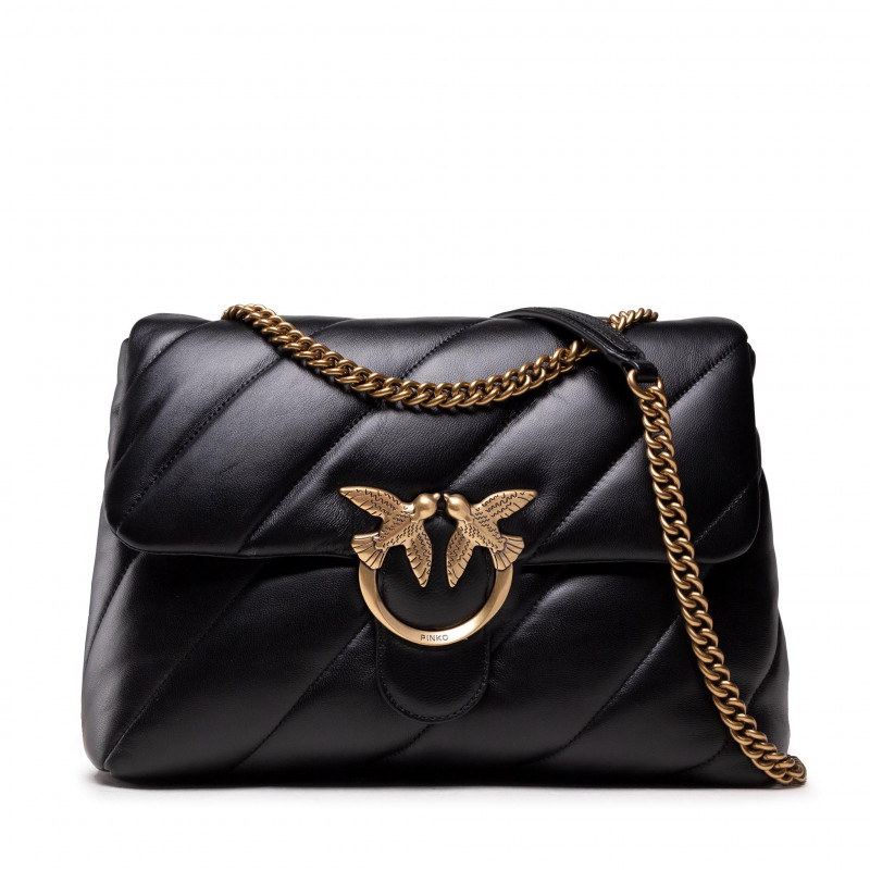 Pinko torba Big Love kvalitetna kožna torba izrađena je od prošivene nappa kože. Naramenica je duga 108 cm i kombinira klasični okrugli metalni lanac s praktičnim kožnim jastučićima za ramena. Dimenzije torbe su 32cm x 24cm x 11,5cm.